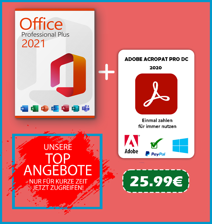 Das Paket aus Microsoft Office 2021 Professional Plus und Adobe Acrobat Pro 2020 ist die ideale Lösung für Berufstätige, Unternehmen und Studierende und vereint zwei wichtige Softwarelösungen für Dokumentenmanagement und Produktivität.